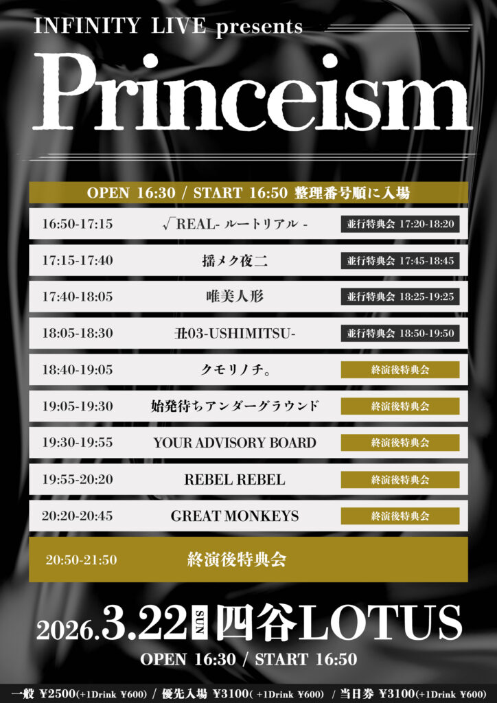 一般 ¥2500 / 優先入場 ¥3100 / 当日券 ¥3100